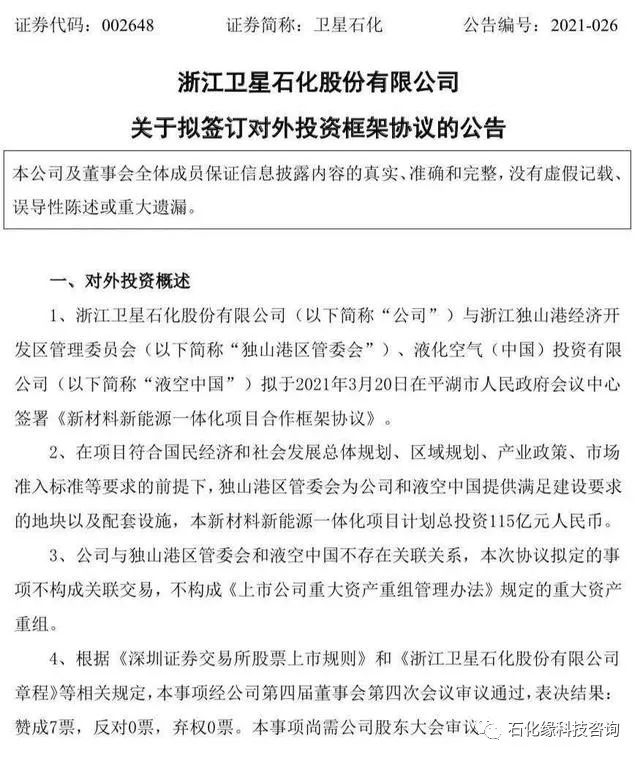 近日,衛星石化發布公告稱,公司與浙江獨山港經濟開發區管理委員會(簡稱“獨山港區管委會”)、液化空氣(中國)投資有限公司(簡稱“液空中國”)擬于2021年3月20日在平湖市人民政府會議中心簽署《新材料新能源一體化項目合作框架協議》。