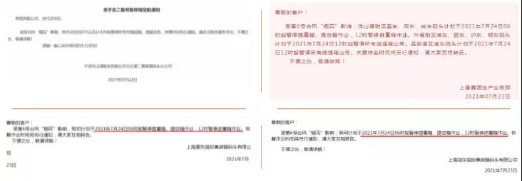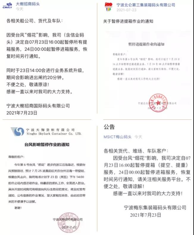 受臺風影響的不僅僅是浙石化的貨源,目前寧波大榭招商碼頭、梅山碼頭、北侖第三集裝箱碼頭、北侖第二集裝箱碼頭等已發(fā)布暫停進提箱作業(yè)的相關(guān)通知。有做箱計劃,盡早安排。預計接下來會有更多的碼頭堆場發(fā)出相關(guān)通知,寧波、上海港各大碼頭預計會陸續(xù)捆扎空箱等。請大家相互轉(zhuǎn)告!