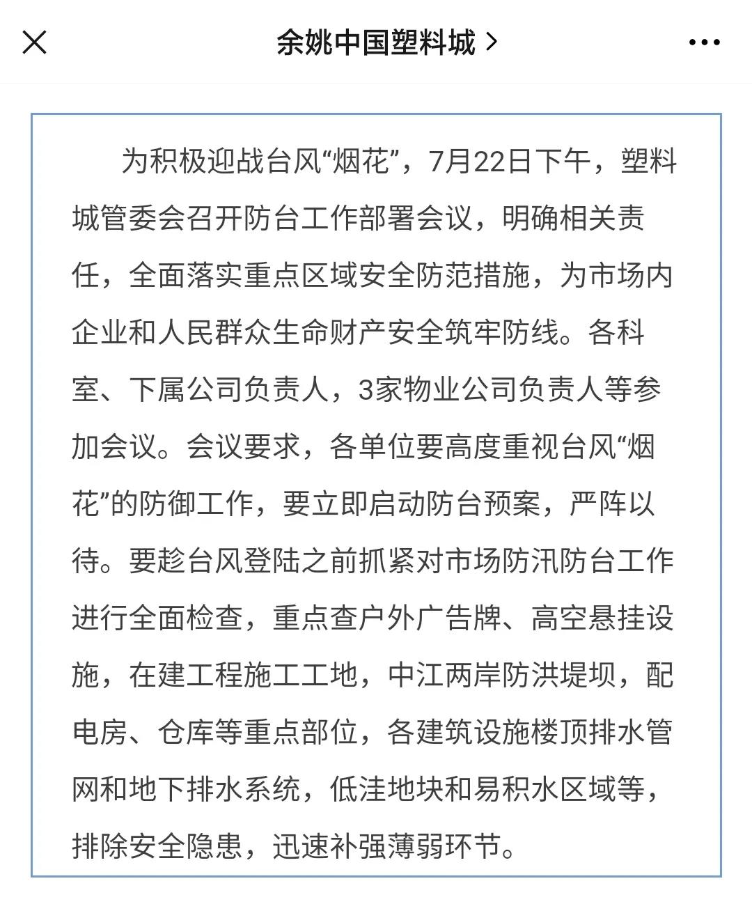 余姚中國塑料城城管委員會也緊急召開了防臺工作委員會。會議要求,各單位要高度重視臺風“煙花”的防御工作,要立即啟動防臺預案,嚴陣以待。要趁臺風登陸之前抓緊對市場防汛防臺工作進行全面檢查,重點查戶外廣告牌、高空懸掛設(shè)施,在建工程施工工地,中江兩岸防洪堤壩,配電房、倉庫等重點部位,各建筑設(shè)施樓頂排水管網(wǎng)和地下排水系統(tǒng),低洼地塊和易積水區(qū)域等,排除安全隱患,迅速補強薄弱環(huán)節(jié)。