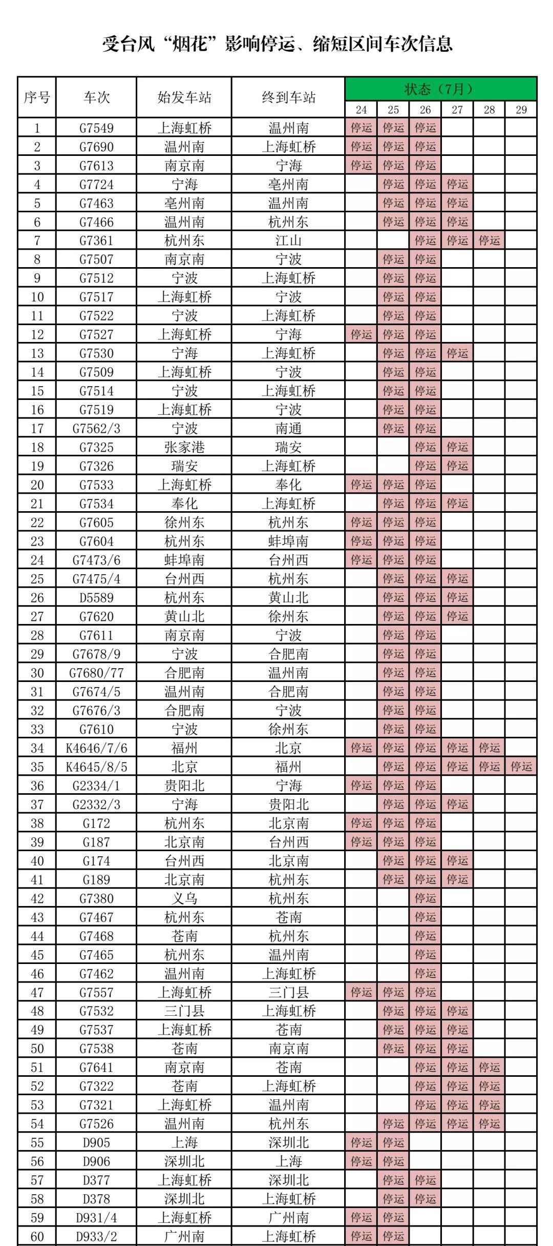 鐵路部門也發(fā)布消息,受臺風影響,7月25日、26日兩天,鐵路寧波站所有列車停運。相關(guān)人士表示,截至目前,7月27日列車開行情況,則要根據(jù)臺風進展進一步明確,鐵路部門會第一時間發(fā)布消息。目前已知停運173趟。另外27日市域列車繼續(xù)全部停運。為確保旅客列車運行安全,鐵路部門決定自7月24日至29日,鐵路部門自7月24日至29日,對杭深鐵路寧波至溫州段、滬昆高鐵和滬昆鐵路義烏至諸暨段、杭甬鐵路、金溫鐵路間列車采取臨時停運措施。具體停運情況如下: