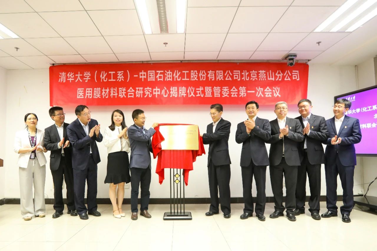 在現(xiàn)場人員的共同見證下,李剛、王鐵峰為清華大學(xué)(化工系)——燕山石化醫(yī)用膜材料聯(lián)合研究中心揭牌,并合影留念。
