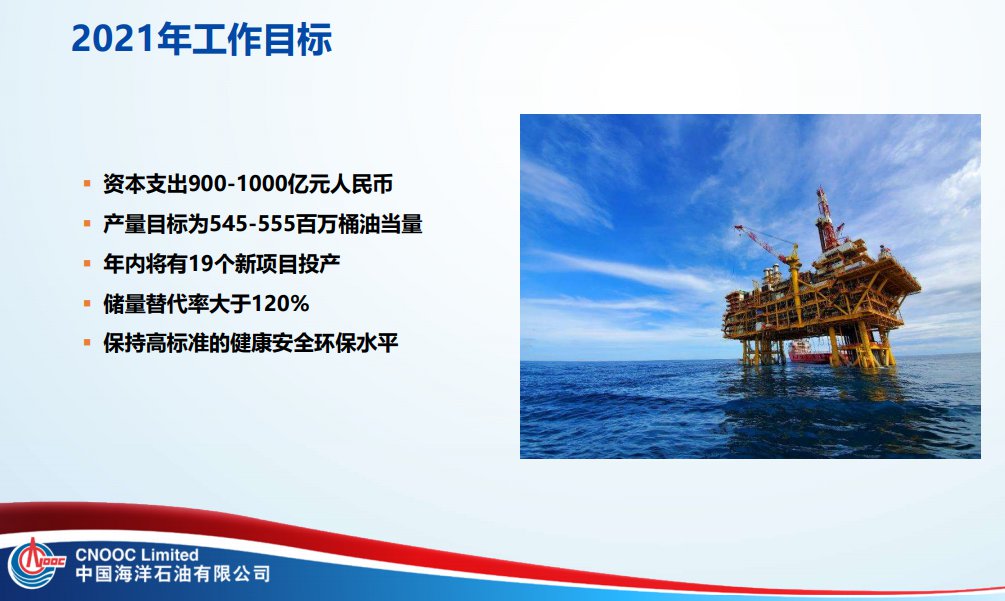 中國海洋石油有限公司今天公布了公司截至2020年12月31日的2020年年度業績:公司全年平均實現油價為40.96美元/桶,平均實現天然氣價為6.17美元/千立方英尺。實現油氣銷售收入人民幣1,396億元,凈利潤人民幣249.6億元,每股基本盈利0.56元人民幣。