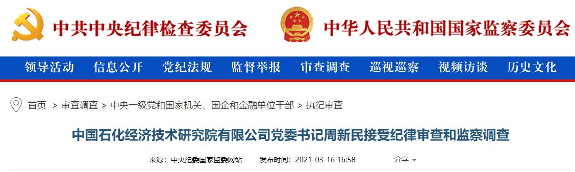 中國石化經濟技術研究院有限公司黨委書記周新民接受紀律審查和監察調查
