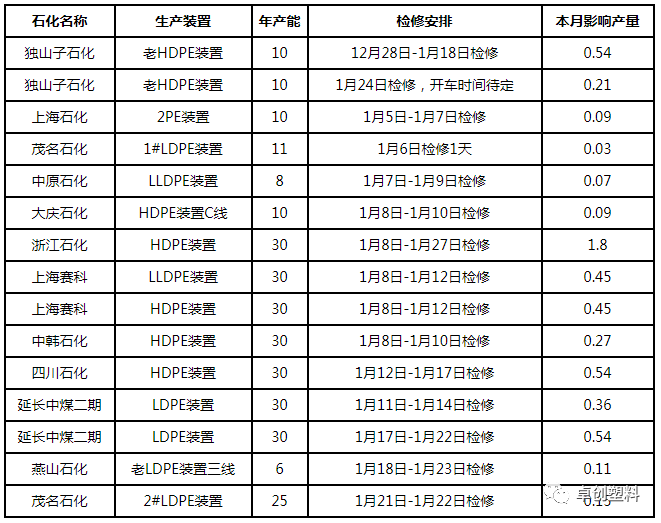 2021年1月國內(nèi)PE裝置檢修匯總表