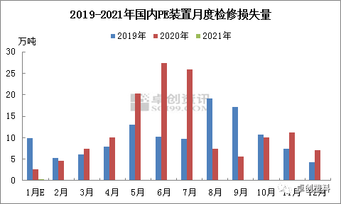 據(jù)卓創(chuàng)統(tǒng)計,1月國內(nèi)PE石化企業(yè)檢修裝置環(huán)比有所減少,涉及檢修年產(chǎn)能在260萬噸,檢修損失量在5.7萬噸,總量較2020年12月減少1.35萬噸。1月僅有獨山子石化和浙江石化大修,其余裝置多為小修,月內(nèi)檢修損失量處于較低水平,對國產(chǎn)供應(yīng)影響不大。