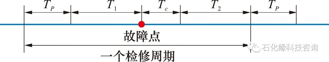 長久以來,國內石化行業配電設備檢修時多采用定期檢修。對于配電設備而言,每年需要進行一次小檢修,運行超過5 a的,則要進行一次大檢修,在此基礎上,每10 a進行一次系統大檢修[2]。圖1為設備定期檢修時間模型,Tp表示常規檢修平均時間,h;T1表示常規檢修完成至發生故障時設備運行時間,h;Tc表示設備出現故障時所需要的故障檢修平均時間,h;T2表示故障檢修完成至下次常規檢修時設備運行時間,h。定期檢修能夠降低設備故障率,減少設備故障時間,延長設備使用周期。如果采用定期檢修,需要檢修人員每隔一段時間進行一次維護工作,這有一個弊端,就是可能會導致檢修過度,增加企業檢修成本。