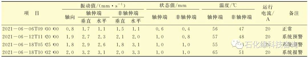 由表1可知,2021年6月12日之前,該電機運行狀態一直良好。6月12日電機振動值變大,至當日11∶20系統發出預警,提示工程師需要到現場查看電機運行情況,工程師現場查看發現該電機運行聲音正常,判斷電機可以繼續運行,未對電機進行處理。6月18日05∶25系統發出報警,工程師至現場查看發現電機有雜音出現,通知生產操作工進行切泵處理,由于該電機切泵操作較多,至當日10∶33電機停機,停機前電機振動值及軸承狀態值持續升高。電機檢修發現前軸外圈彈道有剝落、一個滾珠有剝落,后軸正常。該電機檢修情況充分驗證了該狀態檢修決策系統對電機狀態預判的正確性。