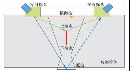 原理:超聲衍射時差檢測技術(shù)是一種依靠從待檢工件內(nèi)部缺陷上、下“端點(diǎn)”處得到的衍射波在掃描線上的時差來檢測缺陷尺寸的方法。采用一發(fā)一收的高精密匹配縱波斜探頭進(jìn)行檢測,在被檢測管道的中心線對稱放置。