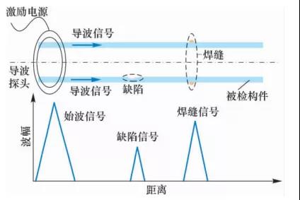 原理:超聲導(dǎo)波在進(jìn)行管道檢測時,導(dǎo)波沿管壁傳播,在管壁橫截面發(fā)生變化處產(chǎn)生反射信號。反射信號的幅度與管壁橫截面積的總變化量有關(guān),通過分析解讀該信號即可判斷管道特征及狀態(tài)。