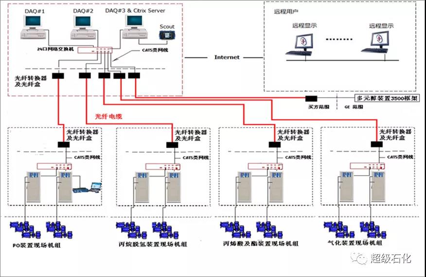 為工程師現場診斷、預判設備故障提供重要的數據基礎。系統網絡搭建及管理中,利用園區生產數據光纜網絡搭建在線診斷系統的專用網絡,并于主服務器開放接口并入到辦公網絡及internet網路(如下圖),實現工程師遠程在線監控診斷、增強故障案例分享效果。