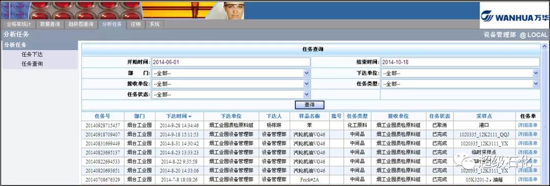 2)油品分析管理系統。潤滑油品狀態的評估也是設備故障診斷工作的重要部分。據統計機械設備的隱患80%由潤滑的問題造成,因此園區針對潤滑油分析組建了油品分析中心,并借助實驗室信息管理的Limis系統(如下圖),