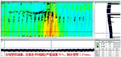 某化工廠的一臺立式機組中冷器,其換熱管規格Φ57×3.5×3500mm,材質10#。應用IRSI檢測系統對該臺換熱器管進行檢測,本次抽檢換熱管20根,發現所有換熱管都有明顯減薄現象,減薄位置在管子與折流板交接處和全管體隨機分布的腐蝕坑,在設備竣工圖紙上查得換熱管的壁厚為3.5mm,而抽查的換熱管檢測中壁厚減薄量高達32%的管壁厚,該最大減薄處剩余壁厚為2.39mm,如圖5所示。