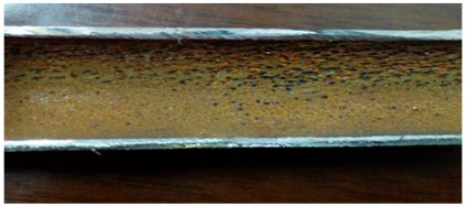 某化工廠的一臺脫光氣塔頂空冷器,其換熱管規格Φ25×3×6000mm,材質10#。應用IRSI檢測系統對該臺換熱器管進行抽查檢測,發現下管板部分換熱管沒有減薄現象,剩余壁厚均勻分布,見圖3-1所示;而上管板部分換熱管存在明顯減薄,且管中間部位嚴重減薄,主要表現在內壁減薄,減薄量超過50%換熱管壁厚,剩余壁厚1.47mm左右,典型圖譜如下圖3-2所示。且對其中指定的一根換熱管進行抽管驗證,證明實際腐蝕與檢測結果基本吻合,圖4為該驗證換熱管解刨后的內壁實際腐蝕狀態照片。