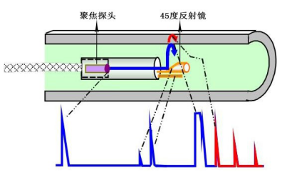 儀器主機、渦輪旋轉頭、對中裝置、定位裝置、耦合裝置、水流管適配器、水浸聚焦探頭、聲反射鏡和目標針等部件是旋轉超聲檢測系統的主要組成部分,其原理是基于脈沖回波檢測法,探頭激發一個高頻脈沖在水中產生超聲波,一個反射鏡將超聲波反射90度變成垂直管壁方向波束,在管子內外表面都會反射回來的一個回波,內表面回波與外表面回波的時間和波幅經系統數字化處理后,通過計算就可以得到管子的內徑、外徑和壁厚。適用于碳鋼,304不銹鋼,316不銹鋼,銅等所有能傳遞超聲波信號的金屬和非金屬材料。圖1為IRIS檢測示意圖。