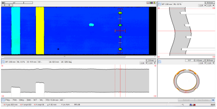 旋轉超聲的檢測過程是先由專業清洗工將換熱器管束清洗干凈,再將管束的一端用塑料堵頭封堵,另一端往管束里充滿水,然后將探頭的對中裝置推入管子內部,通過耦合水泵推動渦輪傳動裝置帶動聲反射鏡自動旋轉,在水中形成垂直于管壁的入射波束,對管束進行周向掃查;通過手動一邊均速拉出對中裝置,檢測系統一邊同時采集數據,采集到的數據能提供管束腐蝕的準確位置,能實時顯示其橫截面圖(B掃描)、管壁展開圖(C掃描)、以及管子縱向截面圖(D掃描),如下圖2所示。