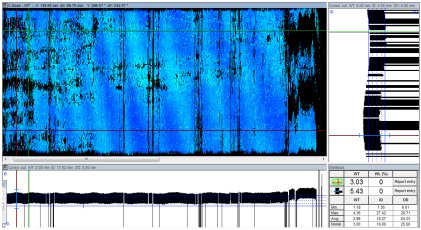 渦輪轉速對于檢測信號亦有很大影響,渦輪轉速不均勻會使圖譜不連續,可能導致管束缺陷特征信號的遺失,從而造成漏檢,因此,每次檢測前必須在樣管上調整好渦輪轉速。圖6中長條狀黑色帶即為渦輪轉速不均勻造成的。